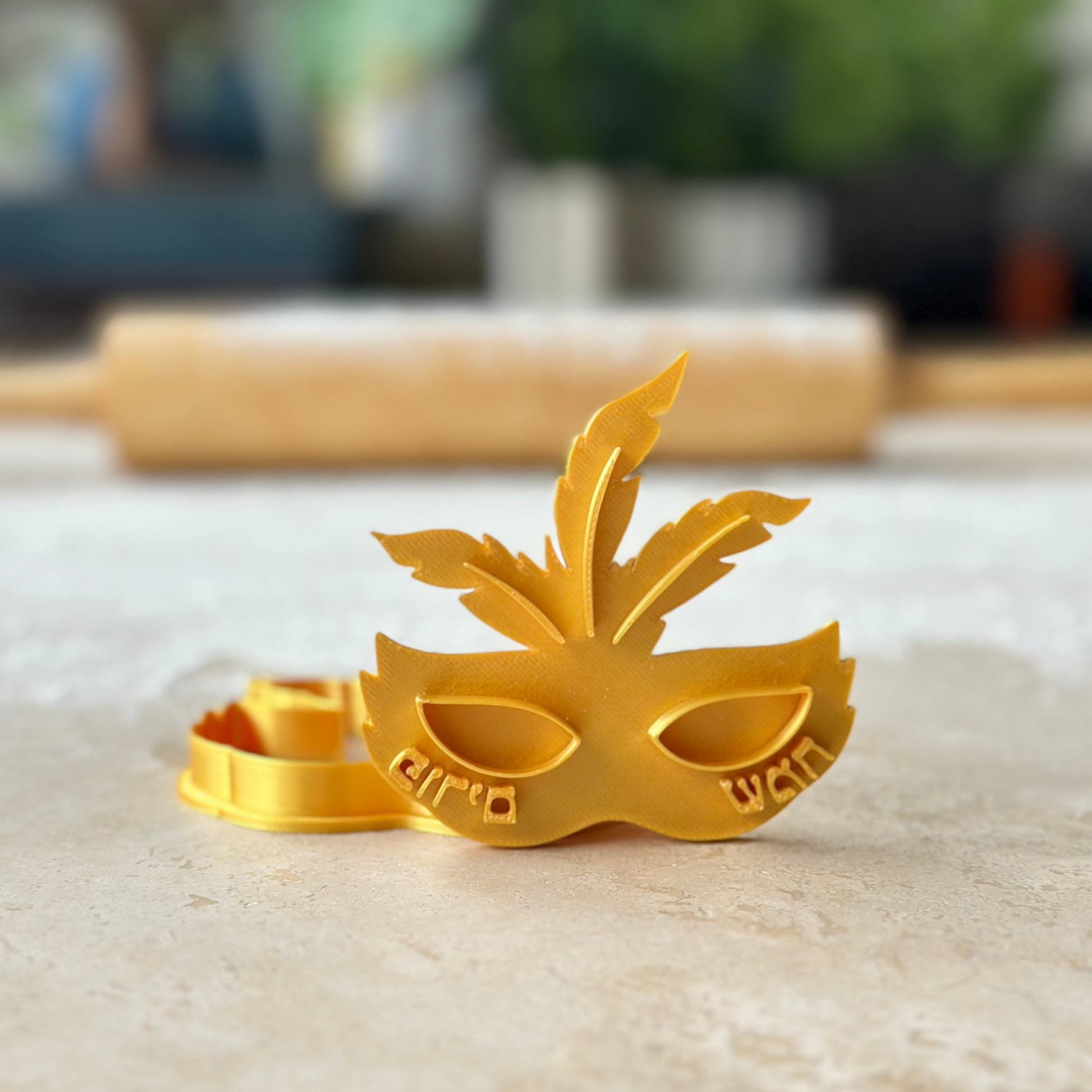 - Emporte-pièce en forme de masque de Pourim orné de l'inscription "Pourim Sameah en hébreu"